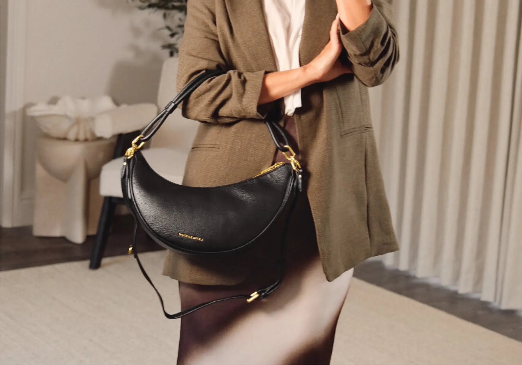 - Luxe gold-tone hardware.